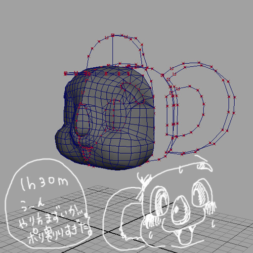 その下準備としてMayaに512pixelに切り取った画像を貼る。めんどくさい。実に無駄な作業。とりあえず正面画像ど側面画像を元に作成しました。